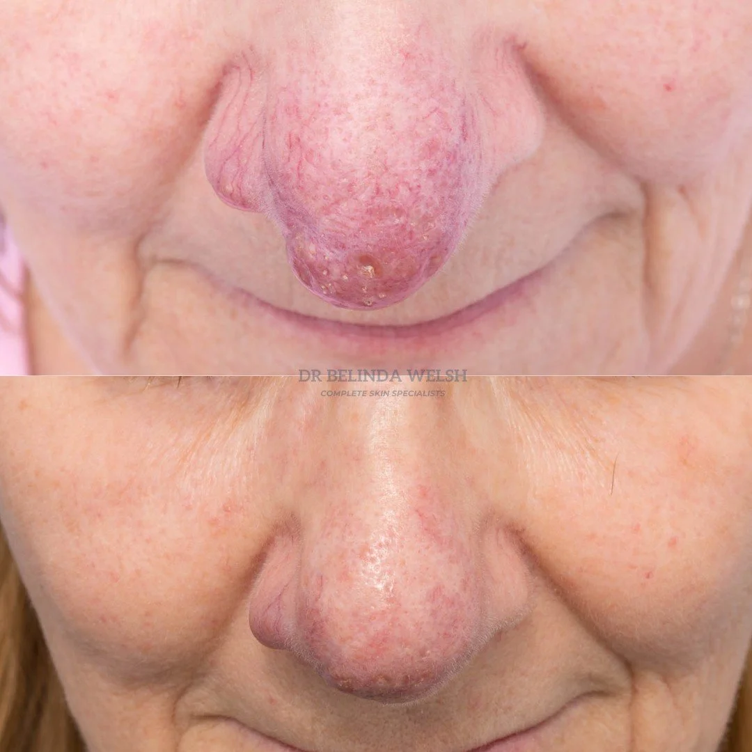 Over a 12 month period with 4 treatment sessions, we saw gradual remodeling of her nose—restoring a more natural appearance, both in colour and shape. Importantly, her results have remained stable with ongoing monitoring.